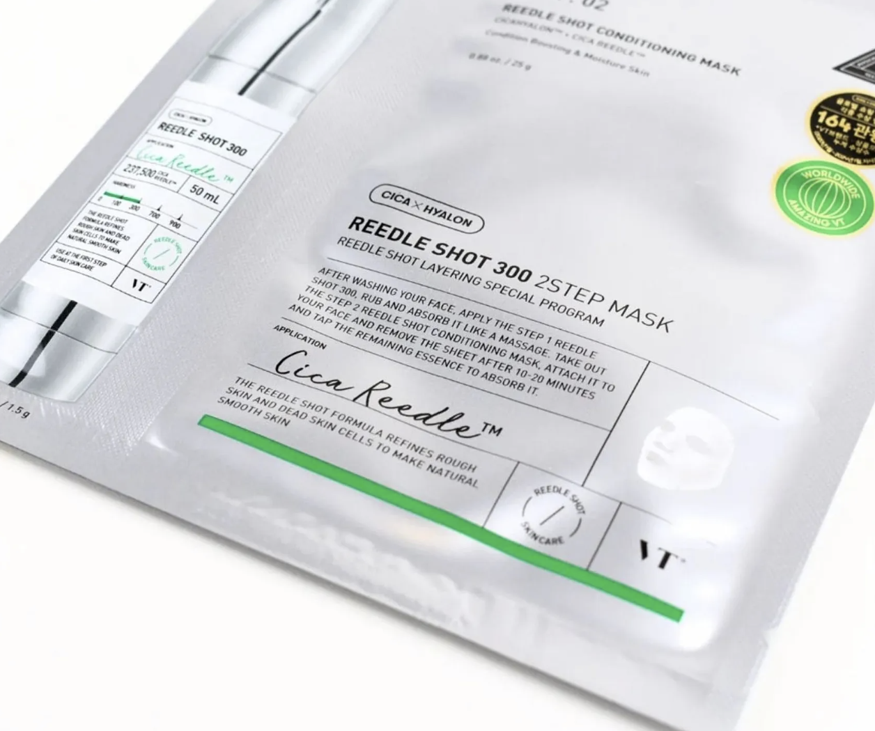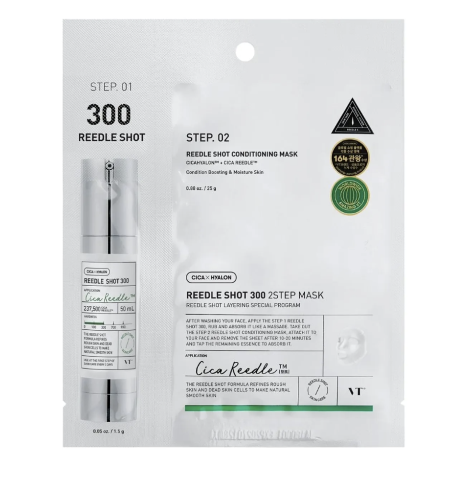 Inspirată de cele mai populare tratamente estetice din Coreea, masca VT Reedle Shot 300 este concepută pentru a „trezi” pielea obosită și a facilita absorbția activelor în straturile profunde. Acest sistem în doi pași folosește tehnologia inovatoare Cica Reedle™ pentru a rafina textura tenului și a oferi un efect vizibil de netezire și luminozitate.